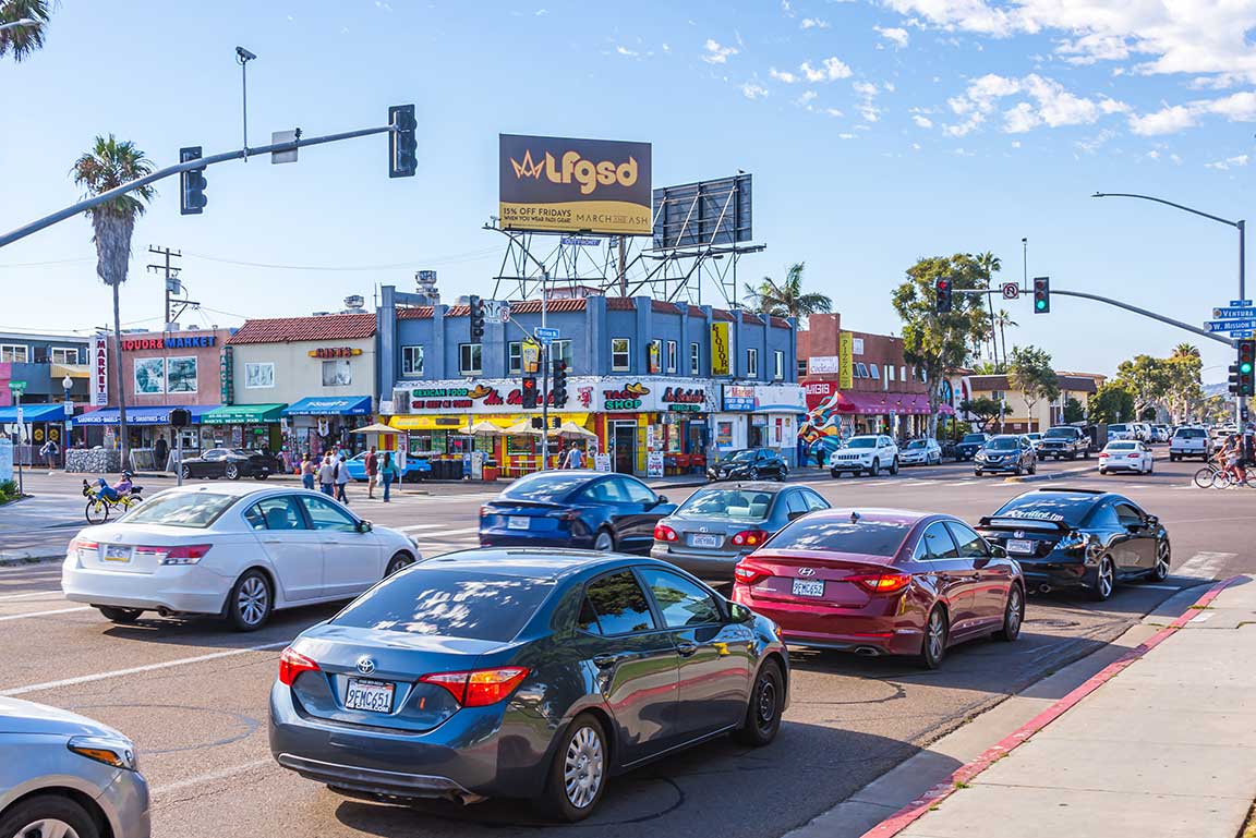 Cannabis dispensary March & Ash encourages an enthusiastic start to the weekend with this poster billboard in San Diego's Mission Beach neighborhood. Photo by Nick Majersky.
