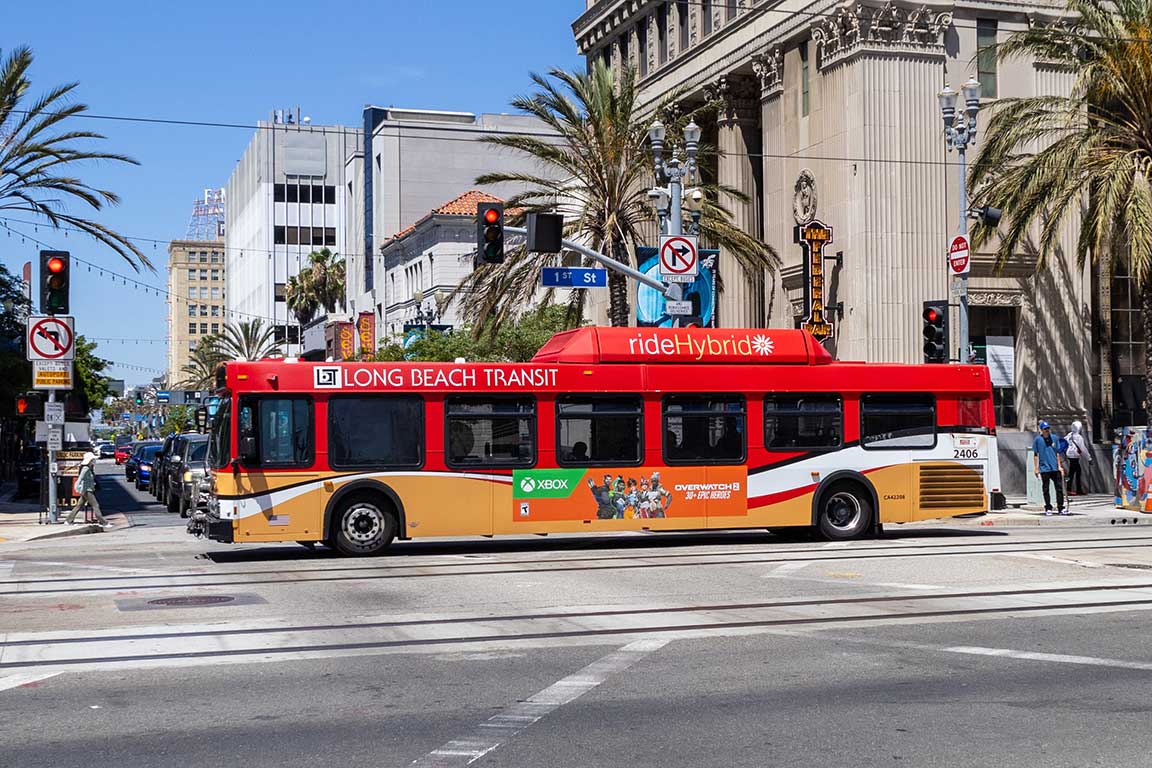 Xbox hypes up the latest first-person-shooter from Blizzard, showcasing Overwatch 2 on this Long Beach bus. Photo by Daniel Almanza.